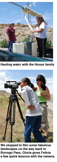 The payoff was worth every step the footage we got is stunning! I was struck by the rich colors we saw along the way and captured on film varying shades of brown and white in the sheep and goats, against the backdrop of the sage green vegetation in the valley and foothills leading up to the mountains. The landscape changed to sun-bleached rocks and highland evergreens as the climb got increasingly steeper. A couple of ample spring storms broke the six year drought Another missing piece of the Woven Ways story was footage that illustrated the daily hardships that result from a lack of electricity and running water in many Navajo homes. We spent a day with our dear friends Bernice House and her daughters Alisha and Felicia, filming the biweekly water hauling routine they go through for grandmother, Dorothy Tolth. The shoot began with a drive out to Dorothy’s home in Borrego Pass. After loading up water containers of varying sizes we headed some 24 miles northwest to the public water pumping station in Crownpoint. The water in Crownpoint is pristine, but that won’t last long (7 years or so) if Hydro Resources Incorporated (HRI) has its way and begins a massive uranium mining project in town. HRI will inject contaminants into the aquifer that provides drinking water to some 25,000 Navajos, including the House family. The day grew hotter and hotter, so the girls welcomed the inevitable splashing that came with the job. Man, do those jugs and barrels become difficult to move when they’re full! Once they were secured in the truck we turned back towards Borrego Pass, completing a 48 mile round trip. Getting the containers off the truck and into the house was the most difficult part of the chore. The girls don’t complain water is a blessing here, and they’re happy to have it. We finished off our visit with the family by visiting close relatives a few miles down the road. Alicia and Felicia piled out of the truck and raced around back to the trampoline. There they joined Cousin Nicole and her two little brothers jumping and singing "Ring around the Rosy" until it made me dizzy just to watch them. Their laughter was so contagious that at one point, they coaxed Gloria to jump into the fun.