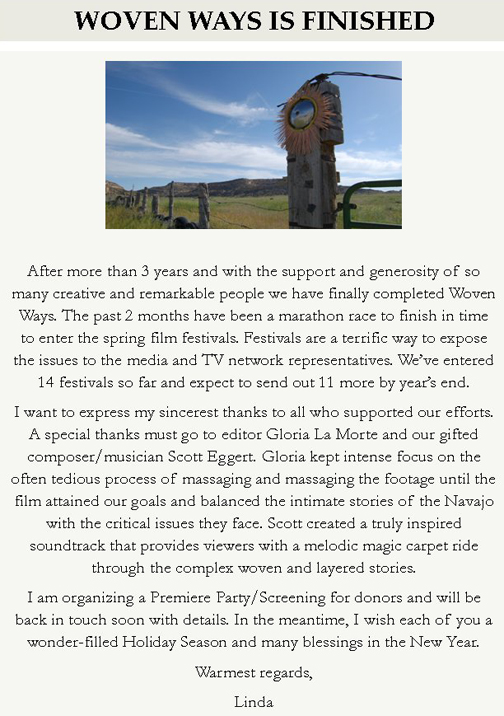 Thanks to the generosity of donors, we're taking Woven Ways on the road again, as momentum builds for the issues the film raises. We're very excited to be heading back to the Navajo Reservatio next month for several important screenings. The trip begins at St. Michael's High School in the Navajo Nation Capital in Window Rock, Arizona. Teachers at the school have organized a screening and a discussion for Navajo students. From there it's on to Santa Fe for the National Trival Environmental Conference, where the film will be used to introduce some of the threats brought about by energy resource projects. Other screenings include a film festival in Grants, New Mexico, and a major media event where the Navajos featured in the film and leaders from the grassroots organizations they represent will speak at a press conference for local and regional press and media outlets. In May, it's on to Washington, where Woven Ways has been accepted into two film festivals. The Hazel Wolf Environmental Film Festival in Seattle brings compelling environmental stories from around the world. The Rainier Film Festival will take place at the base of Mt. Rainier in Ashford, Washington. We plan to make the most of these events and use them as opportunities to engage political leaders, audiences, and the press in the critical issues facing the Navajo. You can help by giving your FREQUENT FLYER MILES, TRAVEL COUPONS, OR DONATIONS to cover expenses for Navajo activists to attend these important events. |
